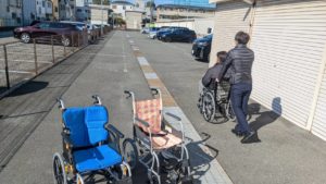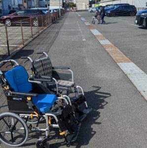 今日は車いすの“乗り心地” “押し心地”を自分たちで体感する研修を行いました。